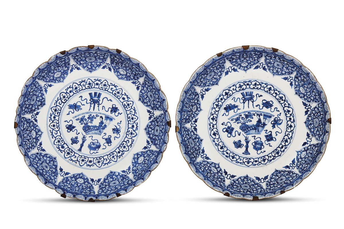 COPPIA DI PIATTI, CINA, DINASTIA QING, SEC. XVIII in porcellana bianco blu a forma di fiore decorata con “otto oggetti preziosi” e figura femminile entro riserva a forma di ventaglio. Diam.cm 36 清 十八世纪 青花八宝纹开光仕女赏花盘一对