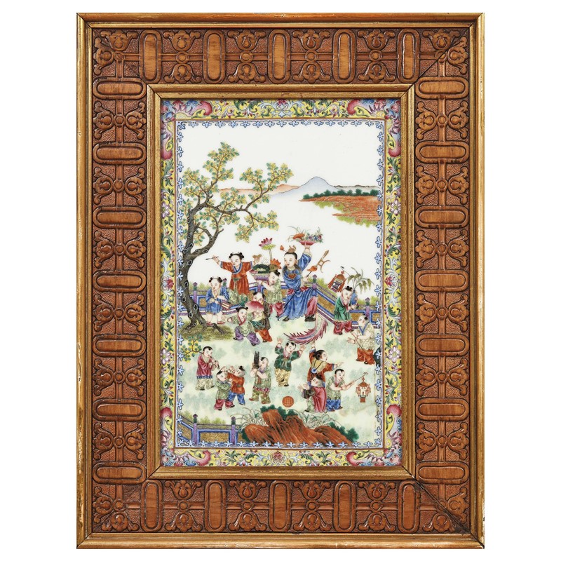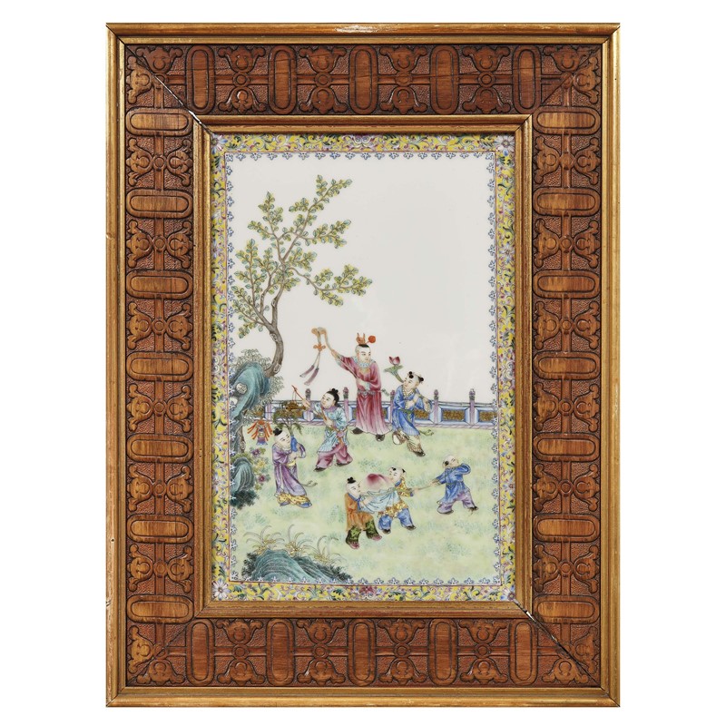 COPPIA DI PLACCHE, CINA, PERIODO DELLA REPUBBLICA (1912-1949) in porcellana policroma raffigurante bambini in giardino. Dim.cm 32 x 21 民国 1912至1949 粉彩婴戏图瓷板一组两件