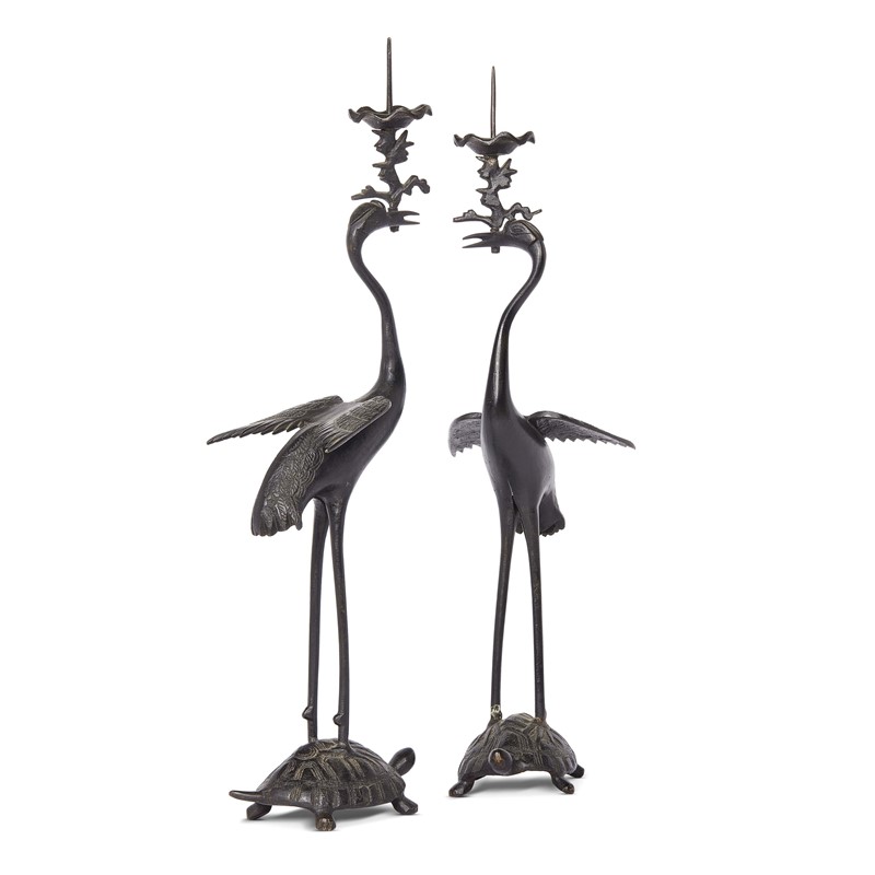 COPPIA DI PORTE CANDELA, CINA, DINASTIA MING, SEC. XVII in bronzo raffigurante uccelli mitichi Gru sopra tartarughe, notata come simbolo che protegge mortali dai disastri idrici. Alt.cm 41 明 十七世纪 青铜仙鹤踏龟灯台一对两盏