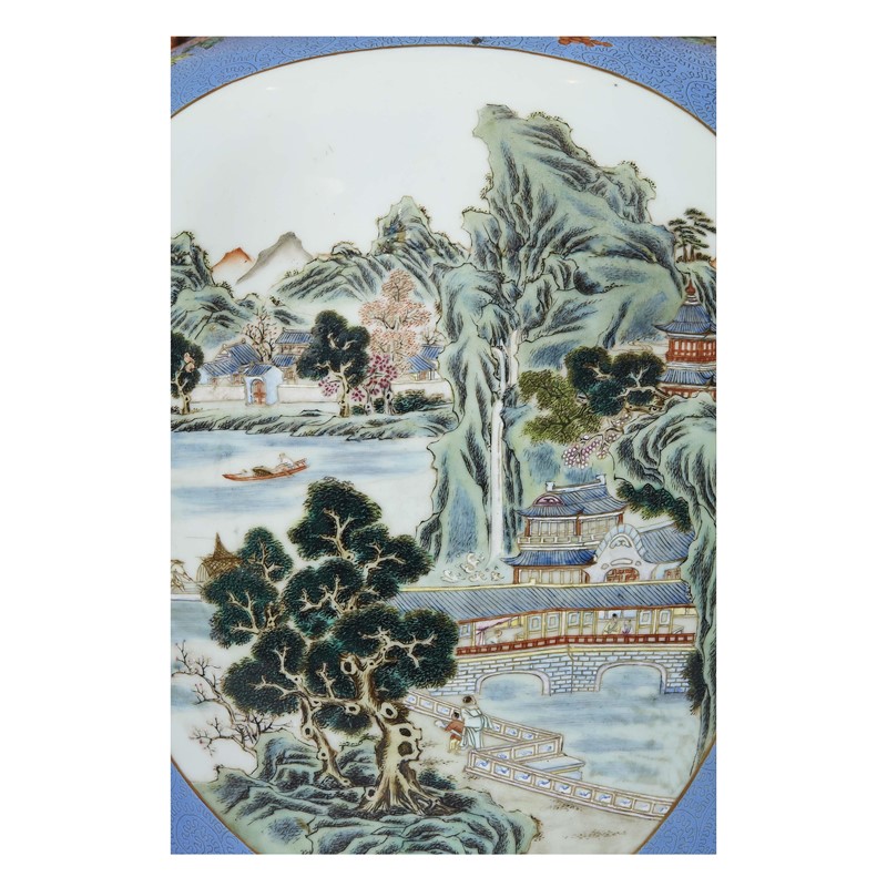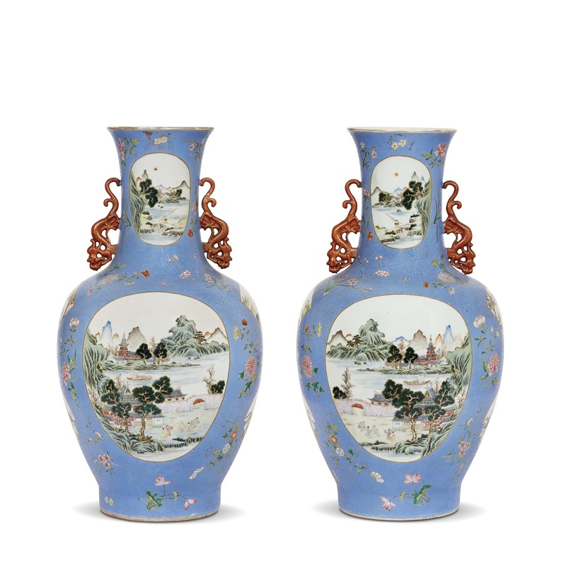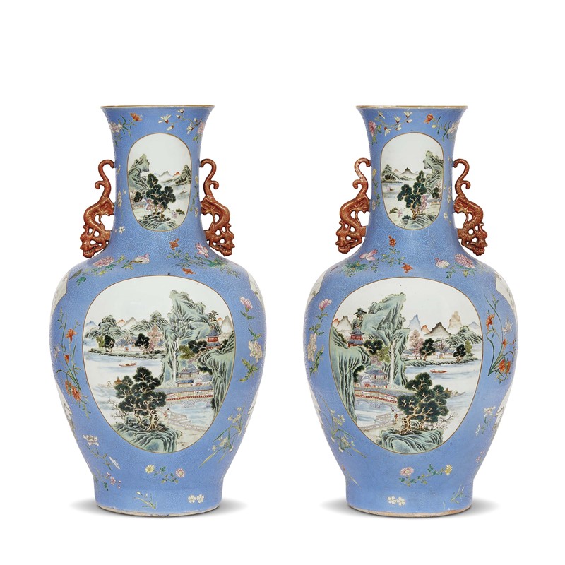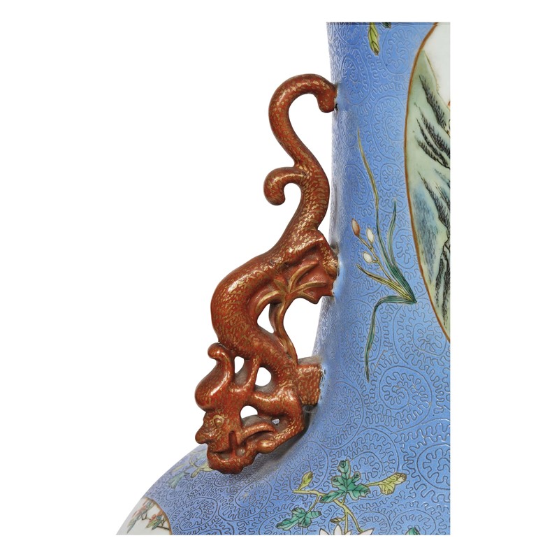 COPPIA DI VASI, CINA, PERIODO DELLA REPUBBLICA (1912-1949) in porcellana turchese con decoro graffiato, dipinta con paesaggi entro riserve, fiori e manici in rosso ferro a forma di drago. Alt.cm 67,5 民国 1912至1949 天蓝釉轧道开光山水图铁红釉描金双龙耳大尊一对