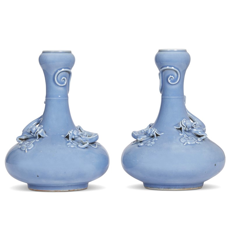 COPPIA DI VASI, CINA, TARDA DINASTIA QING, SEC. XIX-XX in porcellana turchese a forma di bottiglia a collo in forma di bulbo d'aglio con draghi a rilievo. Alt.cm 28,5 晚清 十九至二十世纪 天蓝釉盘双龙耳蒜头瓶一对