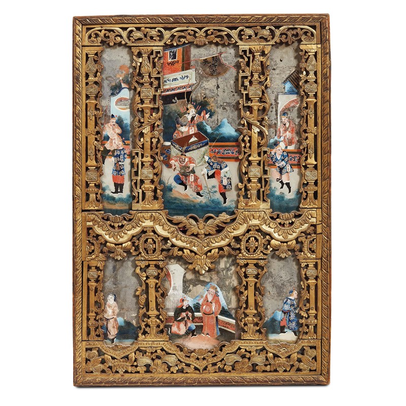 su vetro raffigurante i saggi e scena con cornice occidentale dorata.