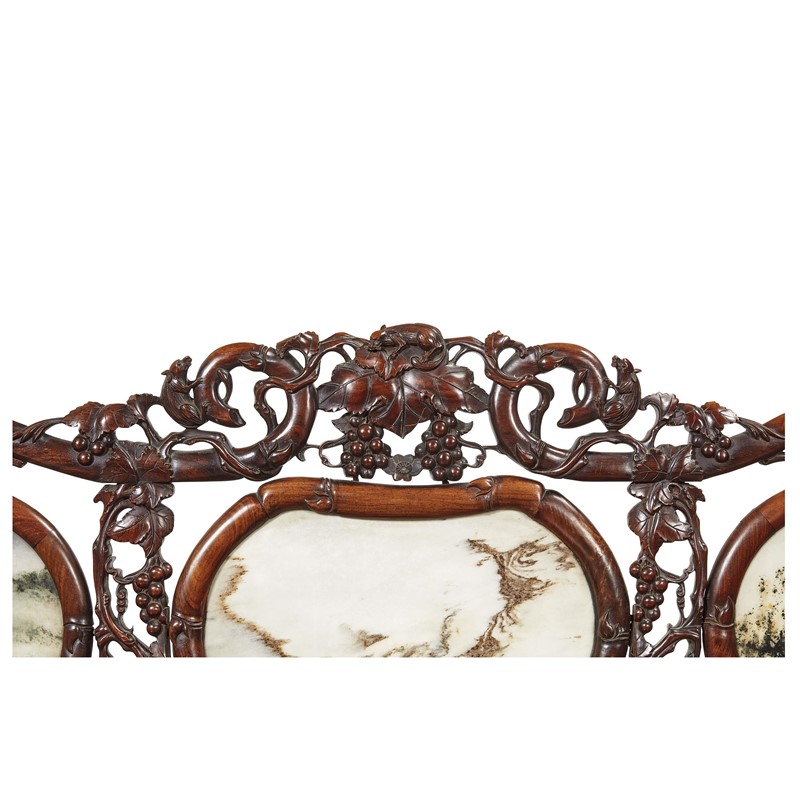 DIVANO E DUE POLTRONI, CINA, DINASTIA QING, SEC. XIX in legno Hong con placche di pietra dura con decoro scoiattoli e uvi traforati incisi. Divano Alt.cm 78 Lungh.cm 155 Prof.cm 54 Poltrone Alt.cm 78 Lungh.cm 57,5 Prof.cm 49,5 清 十九世纪 红木镂空雕松鼠葡萄三人椅圈椅一组三件