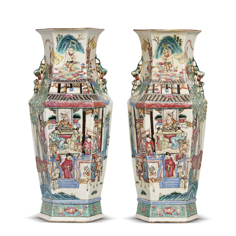 清 十九世纪 粉彩人物故事图六方瓶两件