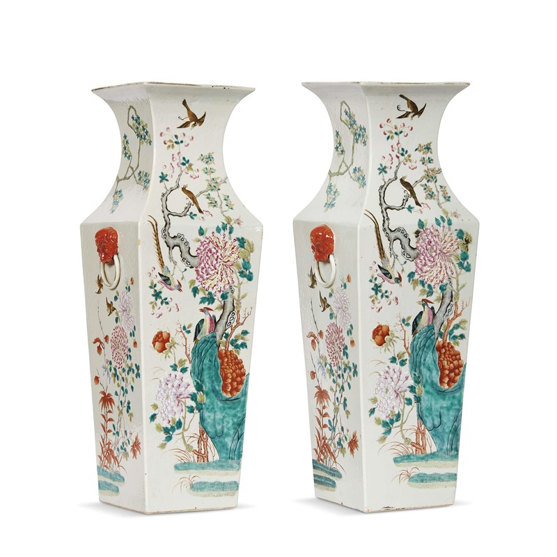清 十九世纪 粉彩花鸟图红兽首耳四方瓶两件