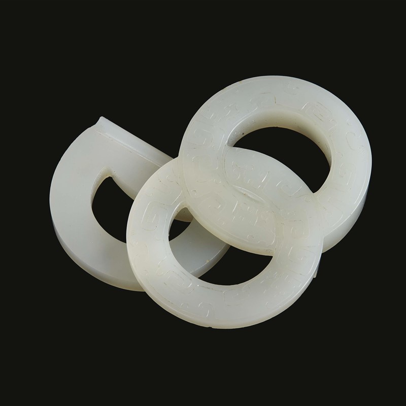 FIBBIA PER VESTE, CINA, DINASTIA QING, SEC. XVII-XVIII in giada bianca formata da un doppio cerchio lavorata decorato con Chilong stilizzati. Dim.cm 4 x 6 清 十七至十八世纪 汉白玉螭龙纹双环带扣