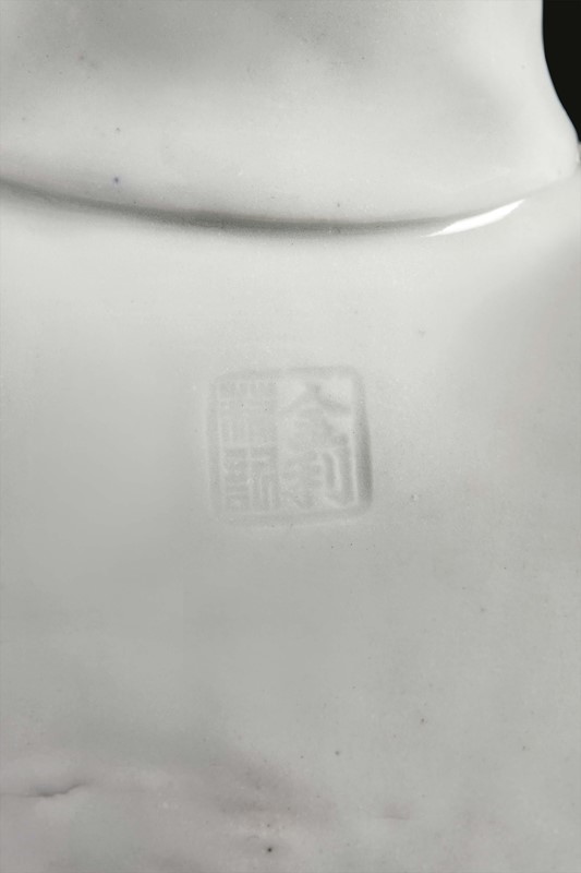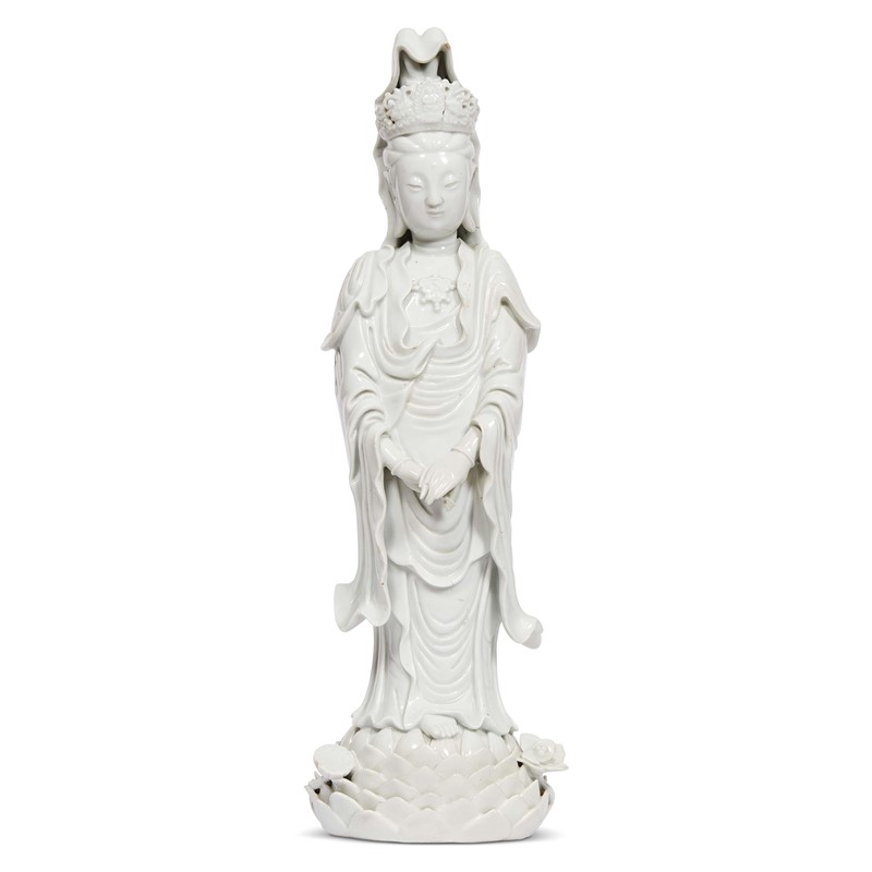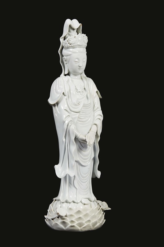 in porcellana Blanc de chine di Guanyin in posizione eretta su base a forma di fior di loto; reca marchio sul dorso.