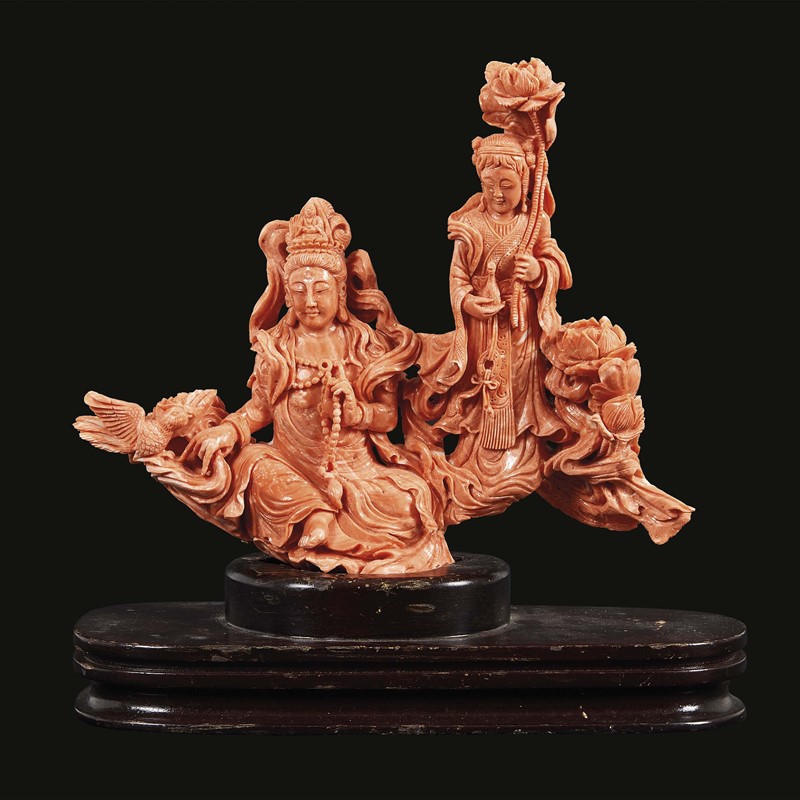 GRUPPO IN CORALLO, CINA DINASTIA QING, SEC. XIX-XX color arancione lavorato con due figure femminili con fiore e volatili. Alt.cm 18 g.616 清 十九至二十世纪 珊瑚雕观音龙女像