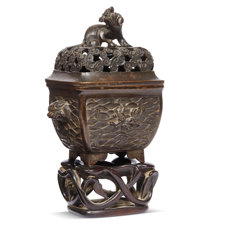 in bronzo a forma squadrata con decoro di nubi e mare stilizzati, leone al coperchio.