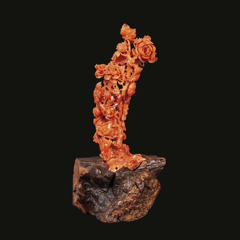 in corallo raffigurante rami di fiori su base in legno a forma di rocca.