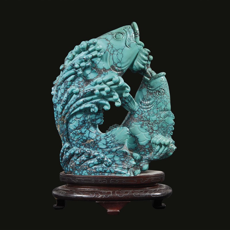 晚清 十九至二十世纪 绿松石双鱼摆件