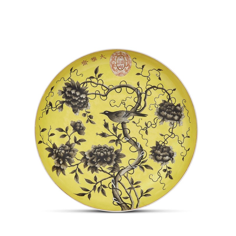清 十九世纪 大雅斋黄地墨彩花鸟盘
