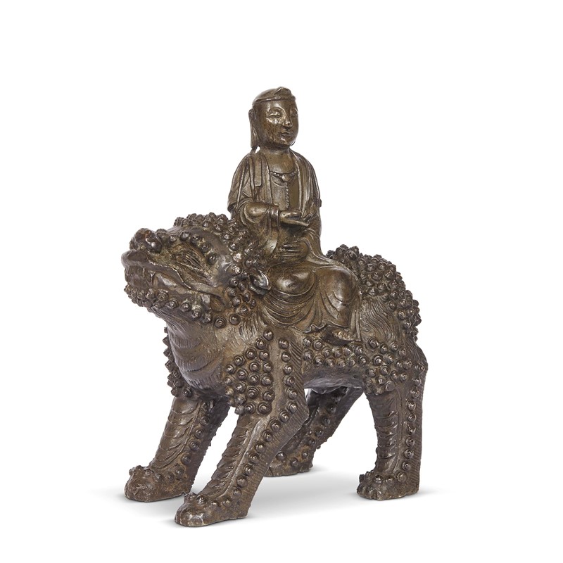 SCULTURA, CINA, DINASTIA MING, SEC. XVI-XVII in bronzo raffigurante bodhisattva Maňjuśrī lett. "Dolce Gloria" seduto su leone. Alt. cm 19 明 十四世纪 青铜文殊菩萨乘青狮像 A SCULPTURE, CHINA, MING DYNASTY, 16TH-17TH CENTURY