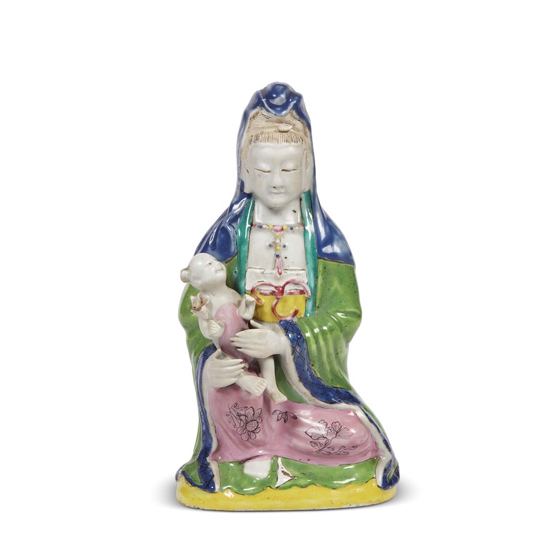in porcellana Susancai raffigurante Guanyin con bambino in braccio.