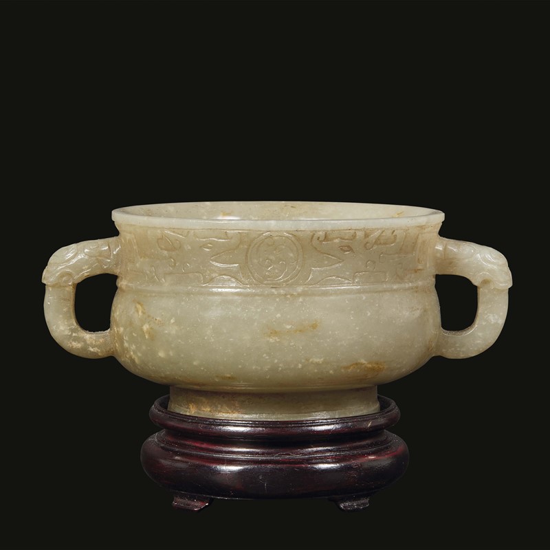 清 十八世纪 青白玉双龙戏珠纹双兽耳杯盏