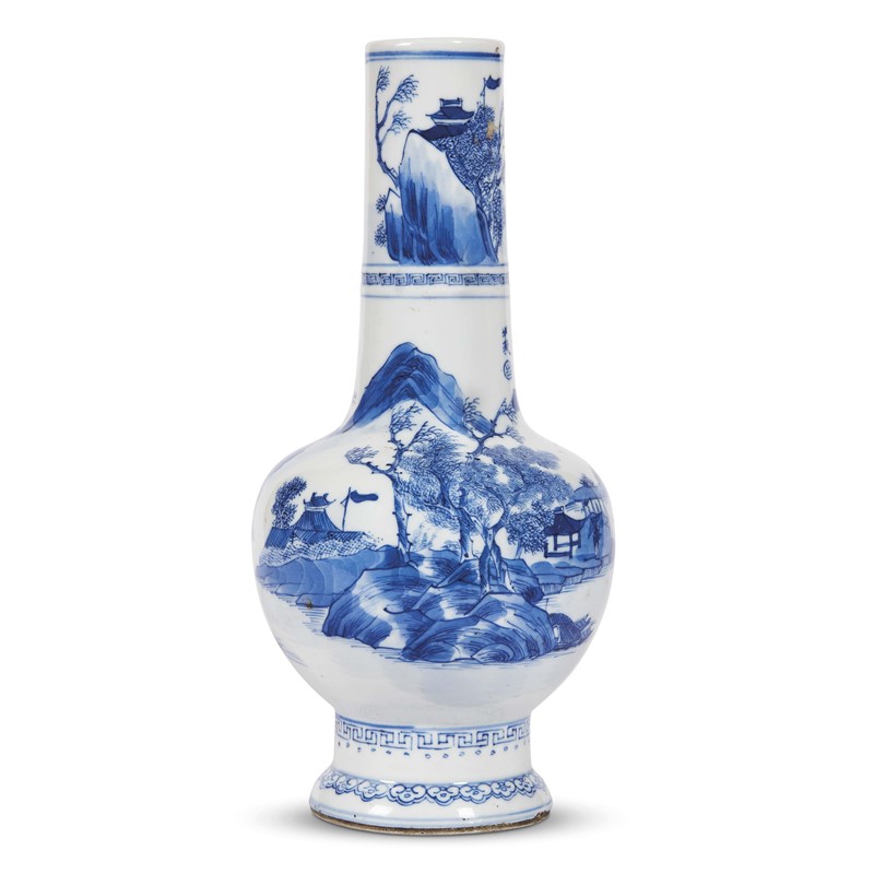 清 十八世纪 青花山水题诗直径瓶 “扁舟满载归装重,细雨轻风得意回。”