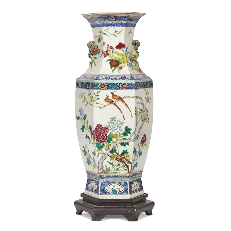 清 十九世纪 粉彩花鸟图折枝桃石榴纹双寿果耳六方瓶