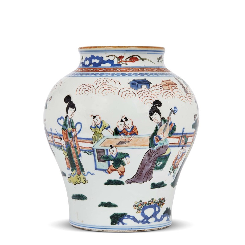 清 十七世纪 青花五彩四妃十六子纹罐