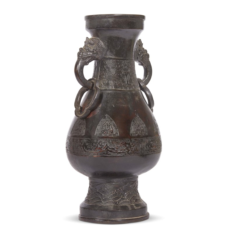 清 十八世纪 双活环龙兽耳凤纹铜瓶