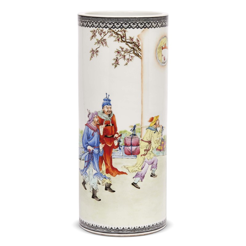 in porcellana policroma a forma di cilindro raffigurante guerrieri.