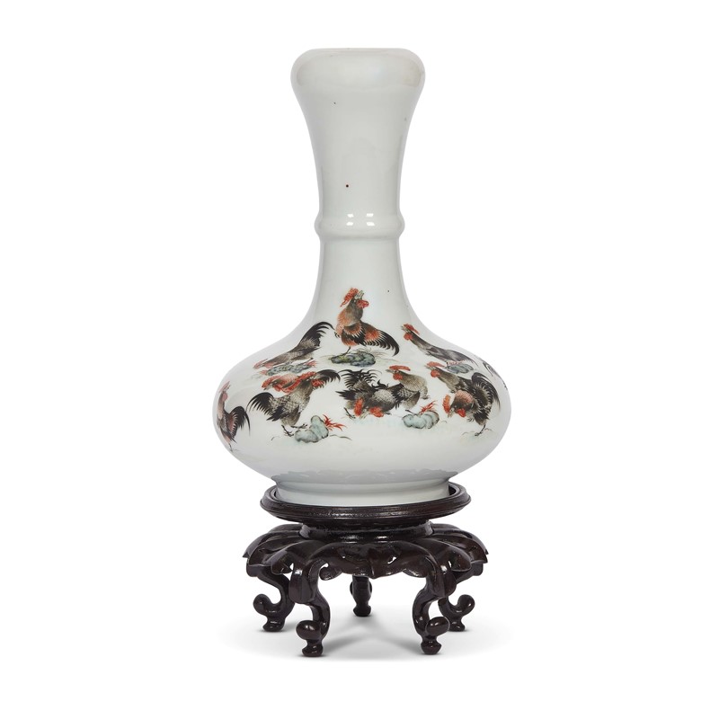民国 1912至1949 粉彩雄鸡图蒜头瓶