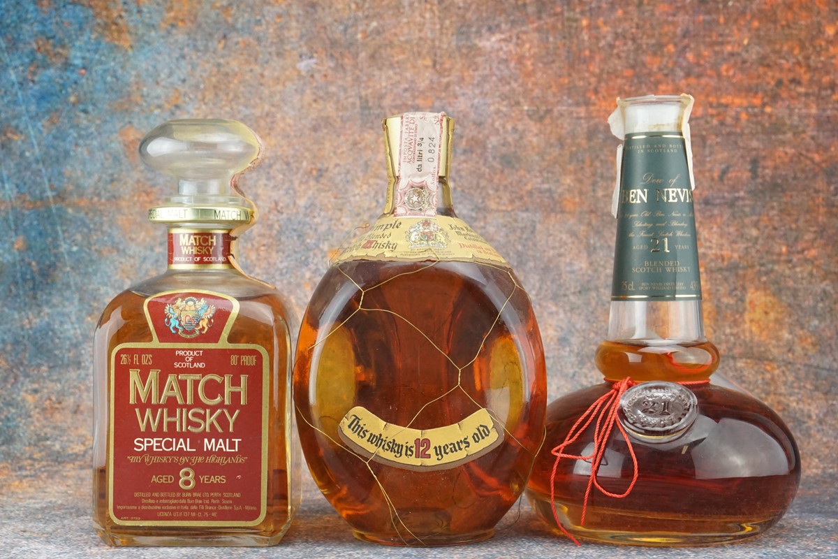 Selezione Scotch Whisky Scotland Match Special Malt 8 Years Old - 1 bt 75 cl 46% vol. Dimple Old Blended 12 Years Old - 1 bt 75 cl 43% vol. Ben Nevis 21 Years Old - 1 bt 75 cl 43% vol. 3 bt E Match Special Malt 8 Years Old- Imported by F.lli Branca Dimple Old Blended 12 Years Old- Imported by Ferraretto Ben Nevis 21 Years Old - Crystal Flask