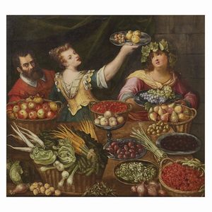 Andrea Mainardi detto Il Chiaveghino (Cremona, 1550 circa – 1617) MOSTRA DI VERDURA E DI FRUTTA CON FIGURE [..]