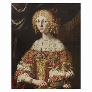 Artista italiano, sec. XVII RITRATTO DI DONNA CON VENTAGLIO IN MANO olio su tela, cm 71x56,5 Italian artist, [..]