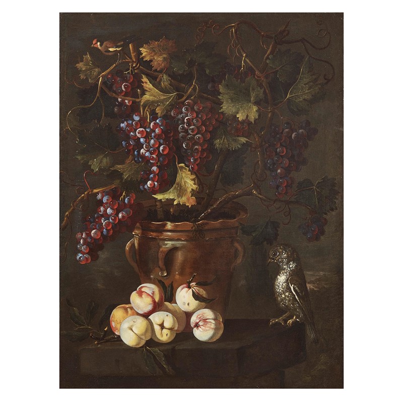 BLACK GRAPES IN A VASE WITH PEACHES AND A BIRD