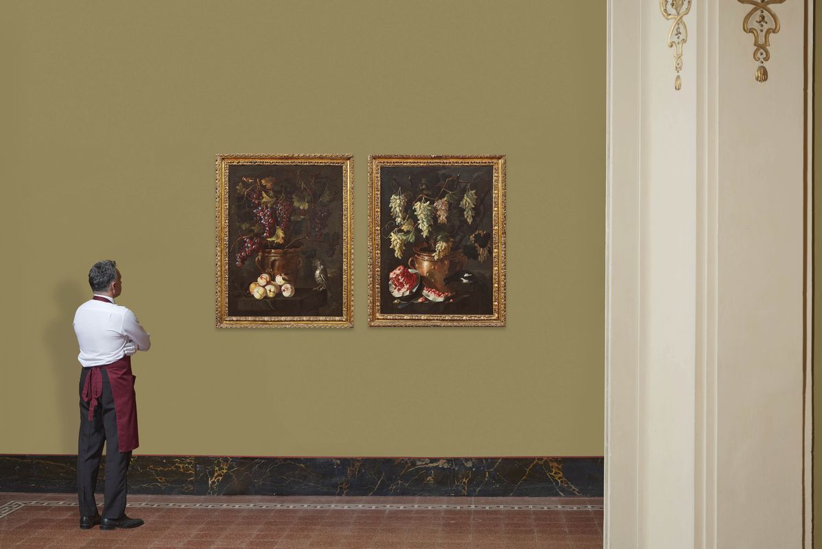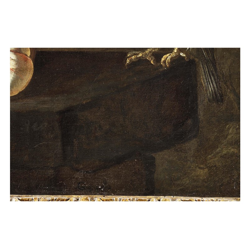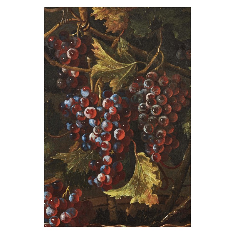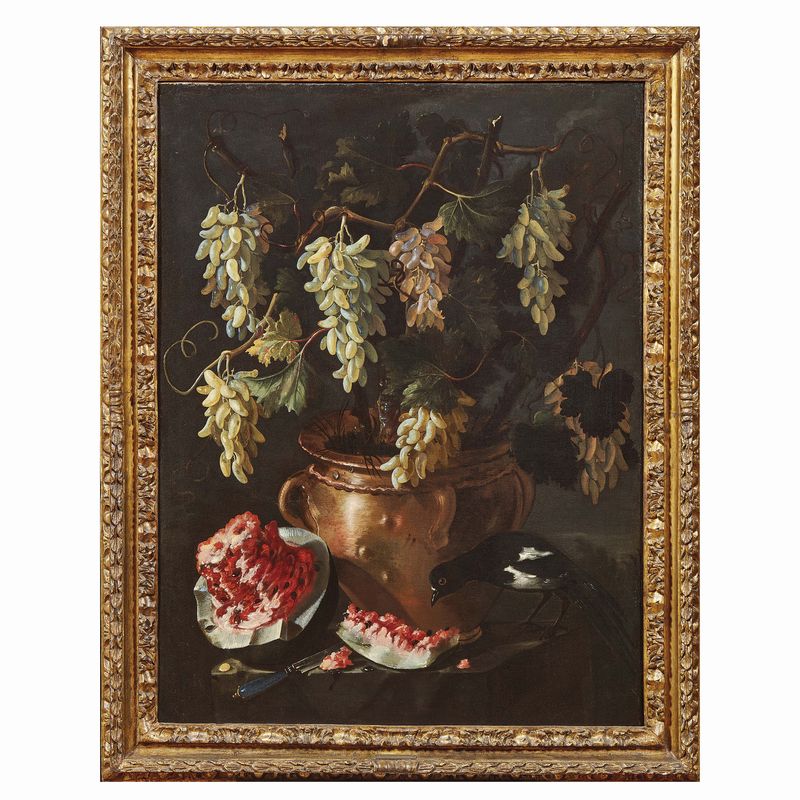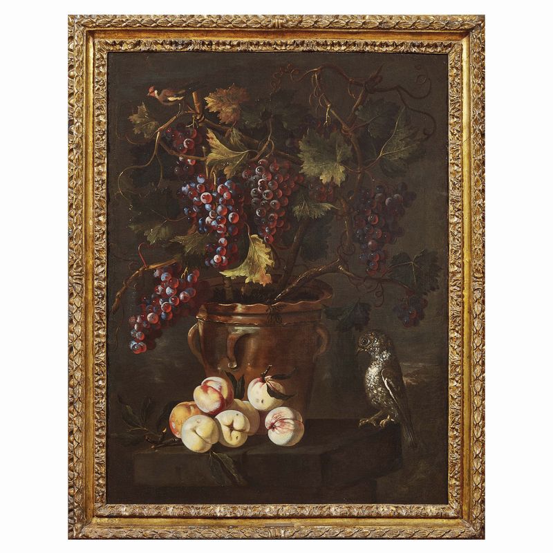 Inconsueti nell’impaginazione della natura morta di frutta, i dipinti qui presentati costituiscono un’interessante acquisizione al catalogo di Giuseppe Ruoppolo, certificando nello stesso tempo il riferirsi dell’artista napoletano al patrimonio figurativo della bottega familiare. Rari nella sua produzione, dove la frutta è solitamente presentata sparsa sul terreno, i vasi lucenti al centro delle nostre composizioni compaiono con relativa frequenza in quelle più ampie e articolate del fratello Giovanni Battista. Citiamo, a questo proposito, la splendida composizione con tralci di uva in vasi maiolicati e frutta all’aperto, sullo sfondo di un paesaggio marino esposta a Napoli nel 2009-2010, da un’importante collezione spagnola (Ritorno al Barocco. Da Caravaggio a Vanvitelli. Catalogo della mostra a cura di Nicola Spinosa, Napoli 2009, pp. 412-13, scheda di Denise Maria Pagano) o ancora l’importante composizione di frutta e fiori in un giardino venduta da Pandolfini nel 2010 (18-10-2010, lotto 141) dove compaiono appunto vasi simili ai nostri.