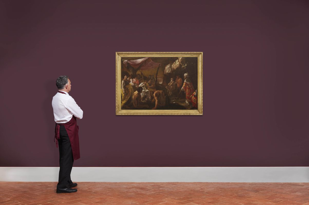 Comparso per la prima volta a Milano nel 2005 e in quell’occasione attribuito al pittore bavarese, il bel dipinto qui presentato differisce in certa misura dalle opere più note del suo periodo italiano per maggiore ampiezza e monumentalità delle figure che lo compongono, più vicine agli esempi di un Agostino Beltrano – richiamato anche nel tendaggio cremisi fissato ai rami, quasi un rustico baldacchino – o di Antonio De Bellis, che non alle figurette spiritate di Micco Spadaro.