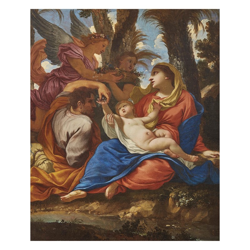 Il dipinto qui offerto, restituito oralmente a Dorigny da Pierre Rosenberg, è stato appunto pubblicato da Arnaud Brejon come opera di ubicazione ignota, spettante alla tarda attività del pittore intorno al 1660. Lo studioso propone di identificarlo con una tela eseguita per l’oratorio di Anna d’Austria nel palazzo del Louvre, la cui descrizione nell’inventario di Nicolas Bailly del 1709 corrisponde alla nostra per soggetto e dimensioni, sebbene di forma ottagonale (il che lascerebbe supporre una riduzione o l’inserimento in una cornice con tale luce): “…. Un tableau représentant une Vierge tenant l’enfant jésus sur ses genoux, saint Joseph acompagné d’anges, sous des palmiers… de forme octagone. Paris au Louvre. Oratoire de la Reyne”.