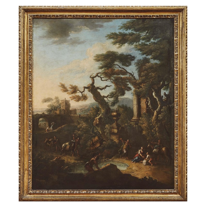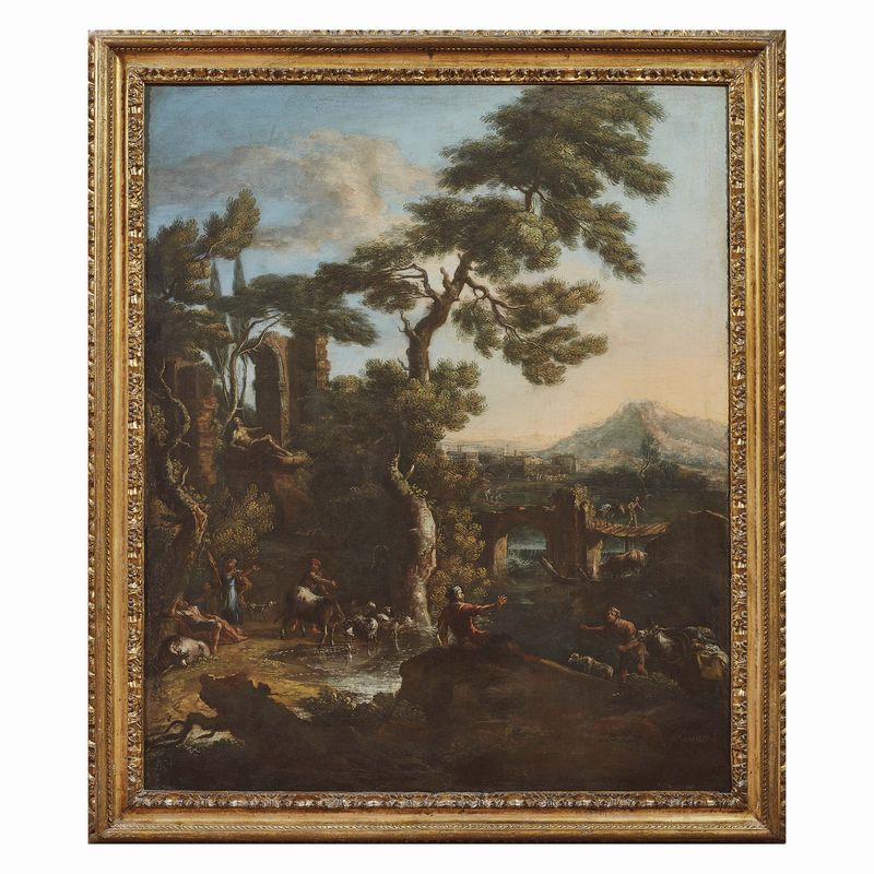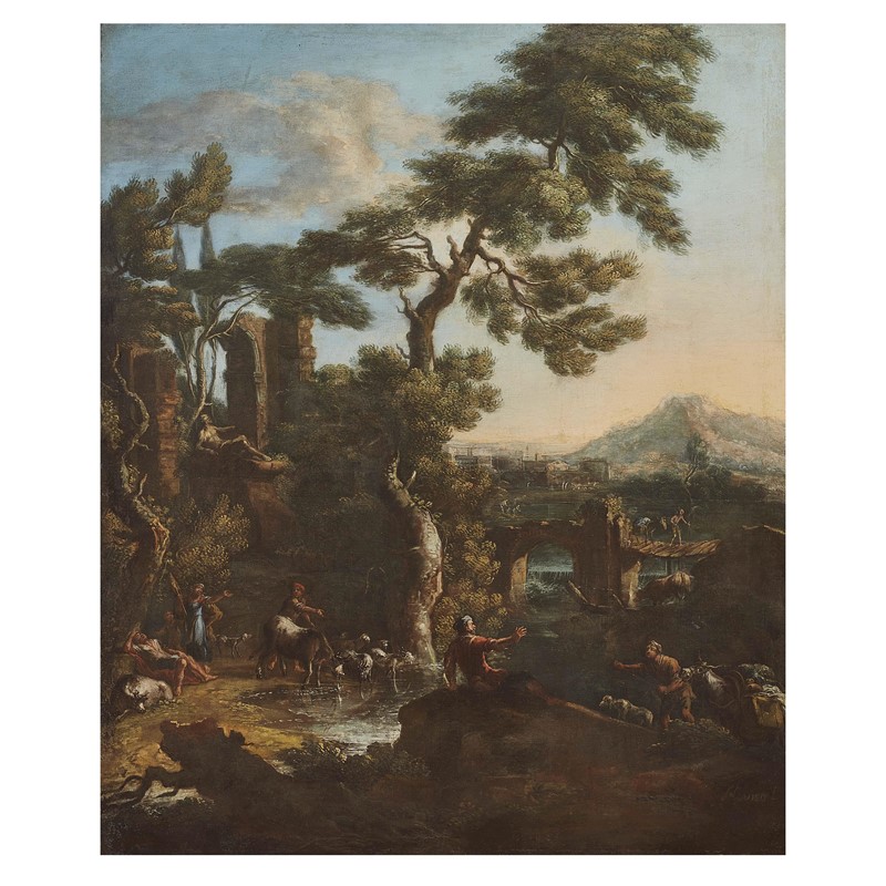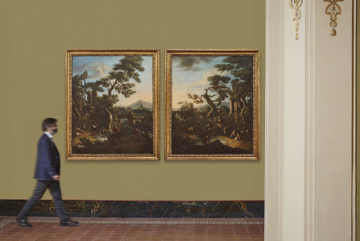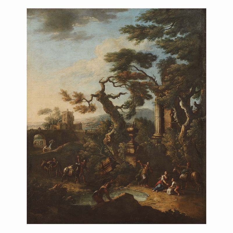 Nicola Viso (attivo a Napoli nella prima della metà del XVIII secolo) PAESAGGI CON PASTORI E VIANDANTI coppia di dipinti, olio su tela, cm 155x128 uno firmato in basso a destra (2)