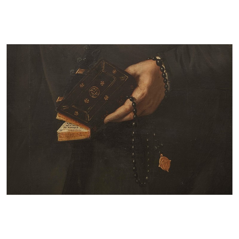Ritratta quasi a figura intera, assisa su una seggiola, la protagonista della tavola offerta, con in mano un libretto che reca sulla copertina al centro il monogramma del nome di Gesù e un rosario accuratamente descritti, è di una sobrietà esemplare: dalla sua veste nera con maniche a sbuffo e bottoni del medesimo colore esce il candido colletto della camicia raffinatamente decorata mentre dal capo scende un velo di cui è resa magistralmente la trasparenza. Questi unici dettagli della mise della nostra effigiata, la cui identità è al momento ignota ma assai probabilmente membro di una famiglia patrizia, illuminano e riequilibrano cromaticamente la sua imponente figura con la stanza entro cui si trova.