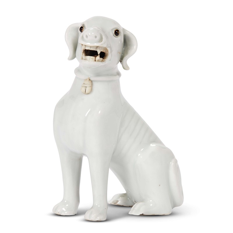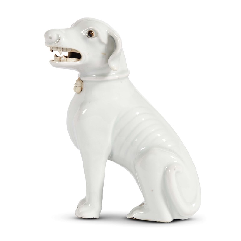 Il cane da caccia seduto diviene un modello molto richiesto, ed è prodotto con versioni più o meno realistiche, con la bocca socchiusa, con le fauci visibili, colorato con smalti rosso ferro e con il pelo definito a piccoli tratti secondo le modalità della porcellana occidentali. Il modello qui raffigurato, bianco, è invece più vicino agli esemplari del periodo del 1730-1750 ispirati ai modelli Kang Xi.
