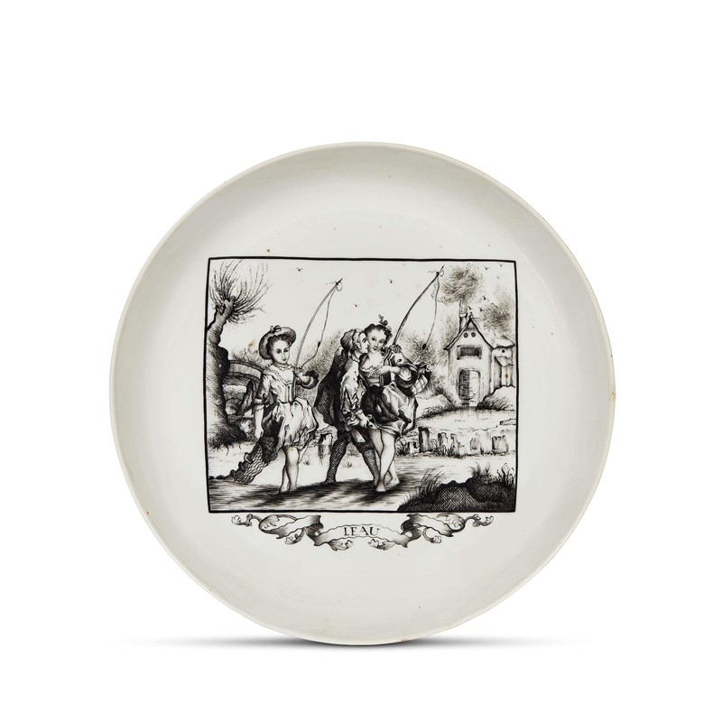 La ciotola in porcellana bianca, sottile, sonora, ha forma emisferica larga con tesa appena rilevata. Al centro il decoro raffigura un trompe l’oeil con incisione raffigurante una scena galante in un paesaggio fiammingo lungo un fiume. Il cartiglio al di sotto dell’immagine con la scritta “LEAU” descrive ironicamente la scena: la pesca, che altro non è che la scusa per un incontro amoroso tra un giovane e una gentildonna, sotto lo sguardo ammiccante di un’altra giovinetta.