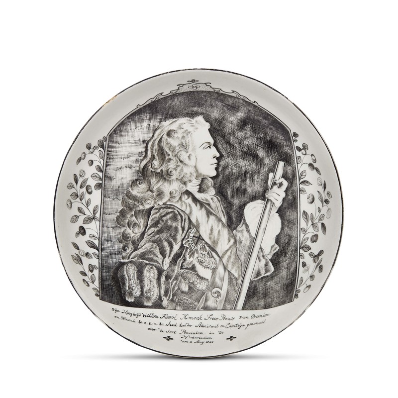 Coerente con l’opera che precede, se ne discosta per impianto morfologico e scelta nell’impianto decorativo. La forma è a ciotola emisferica su piede ad anello e il decoro interessa l’intero cavetto con il ritratto del principe inserito in un cartiglio rettangolare con piante fogliate che lo circondano sui lati, mentre la scritta che ne descrive lo Status è collocata al di sotto del ritratto con qualche differenza nell’iscrizione rispetto al piatto che precede, dovuta al copista: Zÿn Hooghrÿd Willom Karol Hénrok Freso Prenze van Oranion / on Nassau & c & c &. Scad houder Admiraal on Capiteÿn gononaal / over de Sovt Provinlom in de / Nodorlandon / don 3 Moÿ 1747.