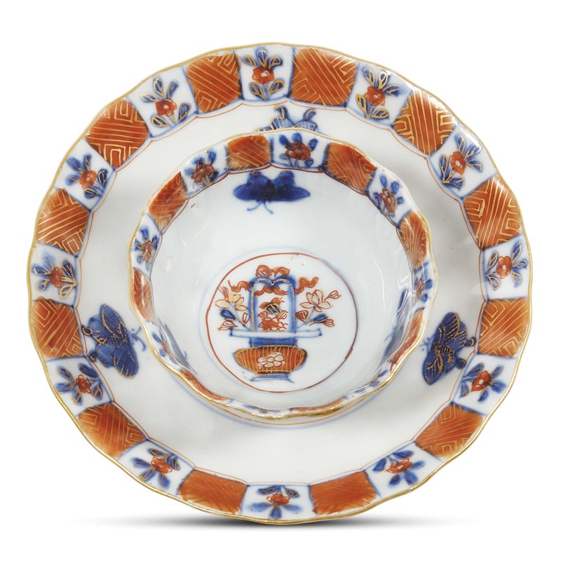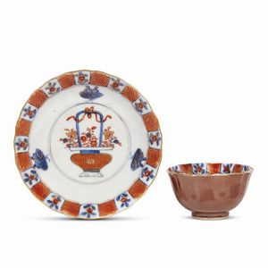 Tazzina a ciotolina con piattino di forma coerente, entrambi leggermente baccellate e su alto piede. Il decoro nei toni del blu sotto vetrina e del rosso ferro è disposto in modo simmetrico a fasce parallele sugli orli con farfalle nella balza e un motivo a cesto di fiori di ispirazione giapponese, il tutto impreziosito da lumeggiature in oro. Al verso un’incamiciatura color caffè ricopre l’intera superficie. Si tratta di un ornato particolarmente apprezzato sul mercato olandese e svedese nella prima metà del settecento denominato Batavian, termine derivato dall’antico nome dell’odierna Jakarta, nel XVII secolo il centro commerciale della Compagnia delle Indie olandese.