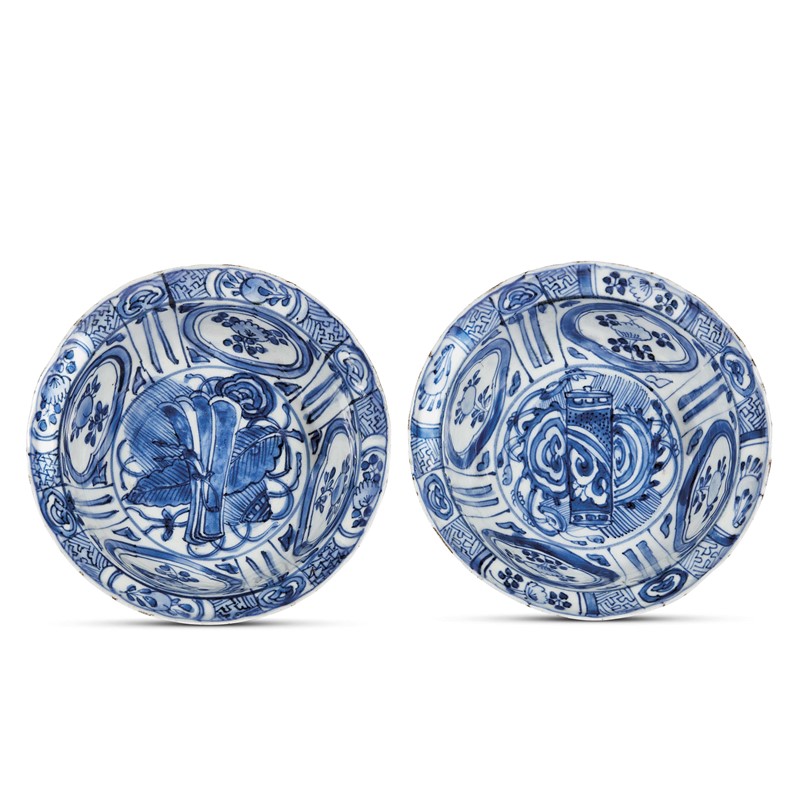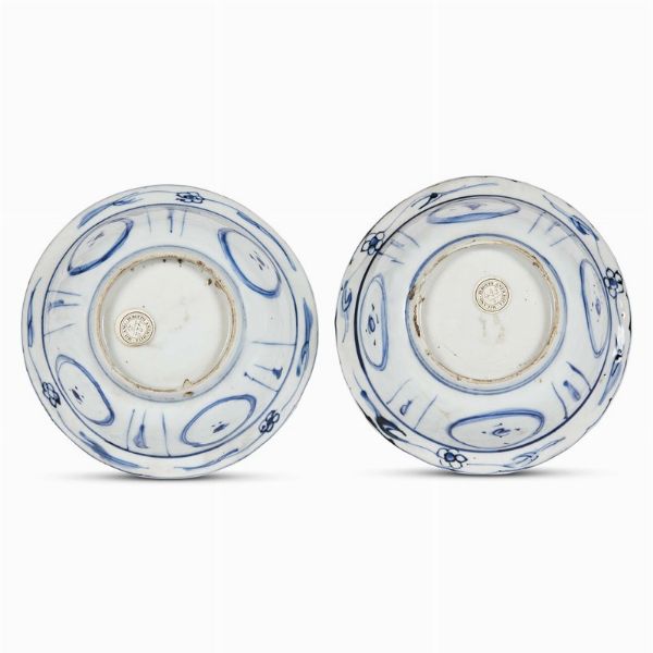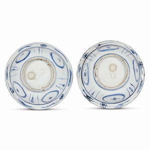 Le due ciotoline di porcellana bianca, dura, sonora, hanno forma a ciotola con orlo appena mosso e tesa estroflessa e breve e poggiano su sottili piedi ad anello. Il decoro in monocromia blu interessa il fronte e il verso. Al centro del cavetto compaiono simboli taoisti uniti a decori naturalistici, circondati sulla balza da riserve centrate da decori floreali, che si ripetono in chiave minore sulla tesa riempita da un ornato geometrizzante. La decorazione è realizzata con rapida maestria e richiama i dettami della simbologia taoista.