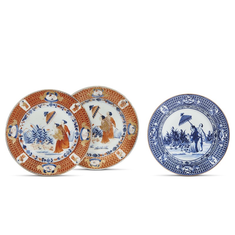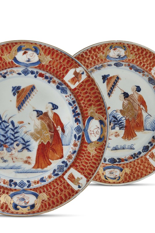 I piatti di porcellana bianca, dura, sonora hanno largo cavetto, balza poco profonda e tesa orizzontale, poggiano su piede ad anello poco rilevato. Entrambe i piatti al verso sulla tesa mostrano il caratteristico decoro con sei insetti delineati in monocromia blu. Il decoro, che riproduce il disegno di Cornelis Pronk noto come Dame au Parasol, è qui dipinto con una tavolozza Imari con largo uso di pigmento rosso-ferro e oro, decoro che in questa palette di colori ebbe grande successo, visto anche il fatto che l’uso di tre colori era ritenuto meno dispendioso rispetto alla monocromia. Secondo gli studiosi i dettagli del disegno di questa serie, di poco successiva alla prima, risultano meno incisivi rispetto a quelli nelle versioni più prossime al disegno originario, e tuttavia la cromia così luminosa determinò un discreto successo di questa serie, con esemplari presenti nelle principali raccolte europee.
