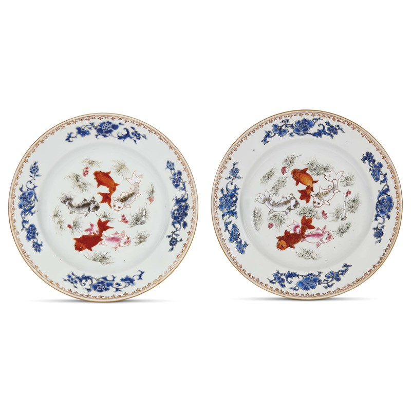 Piatti circolari di porcellana bianca, dura, sonora, con orlo liscio, tesa orizzontale e piede ad anello. Il decoro prevede sulla tesa ramage di fiori in smalto blu sovra coperta con l’orlo bordato da una sequenza continua di punte di freccia, mentre al centro del cavetto alcune carpe nuotano tra sottili alghe. Il decoro è realizzato con smalti sovra coperta secondo i toni della “Famiglia Rosa”. I piatti appartengono ad un’importante serie realizzata sotto il regno Yongzheng, di cui alcuni di grandi dimensioni. La carpa con il corpo coperto di scaglie che nuota controcorrente simboleggia la perseveranza e gli attributi del guerriero. Quattro piatti coerenti per decoro e forma sono conservati al Philadelphia Museum of Art (invv. 1958-93-54 e 1958-93-55)