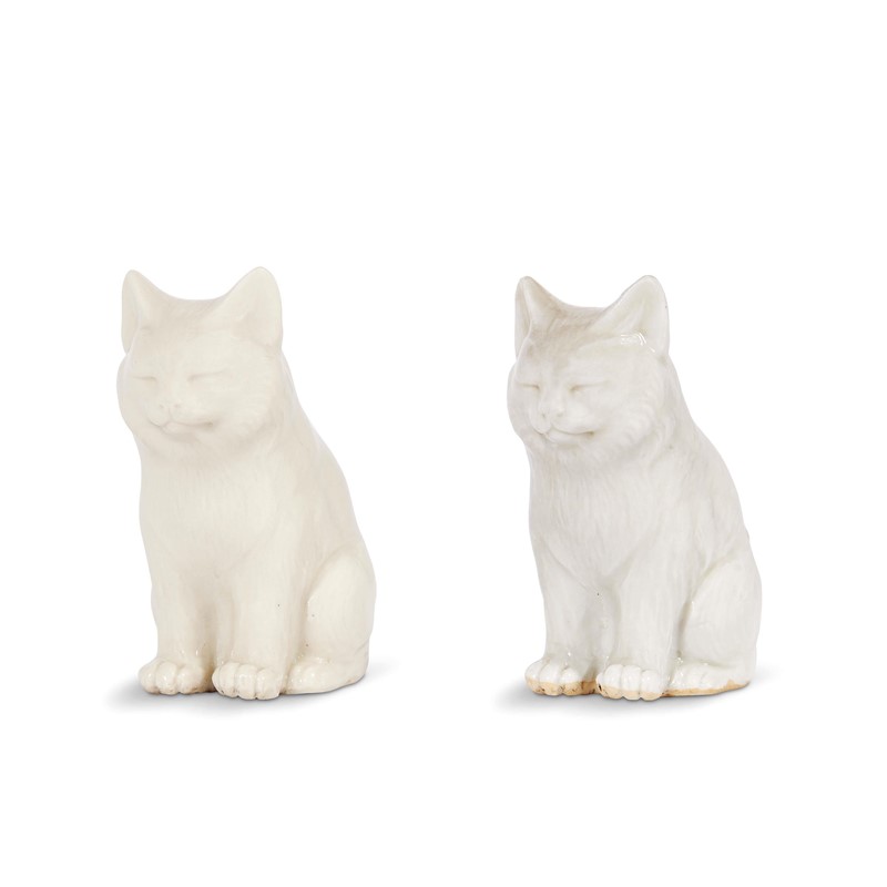 La coppia di piccole sculture foggiate a stampo in porcellana tenera azzurrata con vetrina grigio azzurra, non applicata sotto la base, rappresenta due gattini accucciati sulle zampe posteriori. Resi in maniera naturalistica, privi della policromia, sono molto affini al gusto europeo, probabilmente derivati un modello tedesco.