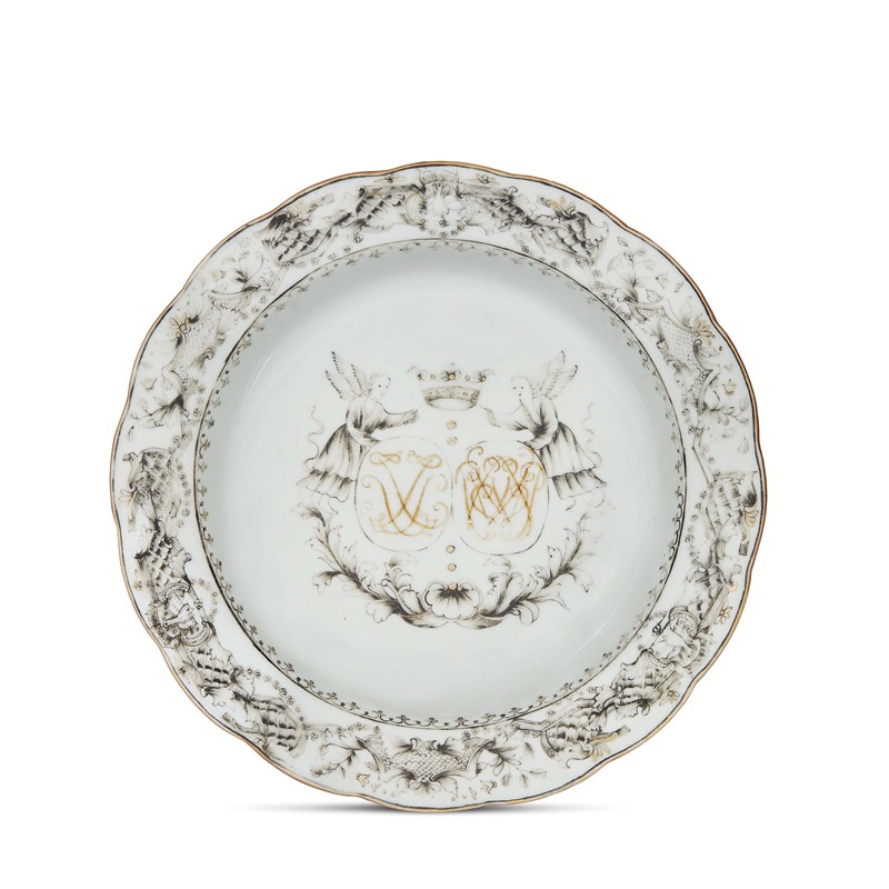 Probabilmente creato per il mercato europeo, forse olandese, questo tipo di decoro trova alcuni confronti musealizzati, spesso associati a elementi decorativi legati alla committenza. Utilizzata dalle varie compagnie europee la realizzazione con iniziali e angeli ebbe grande successo per i servizi ordinati per nozze, con varianti nelle bordure o negli elementi centrali che sorreggono gli emblemi o le iniziali, a seconda della committenza. Per un confronto pertinente si veda ad un esemplare nella collezione Mottahedeh di New York, alla cui scheda rimandiamo per ulteriori confronti.