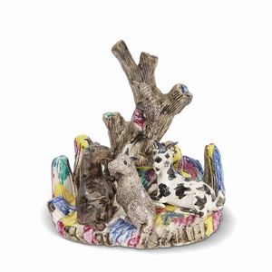 GRUPPO, CINA, DINASTIA QING, PERIODO QIANLONG, 1780 CIRCA in porcellana policroma. Sul fondo etichetta PEROTTO [..]