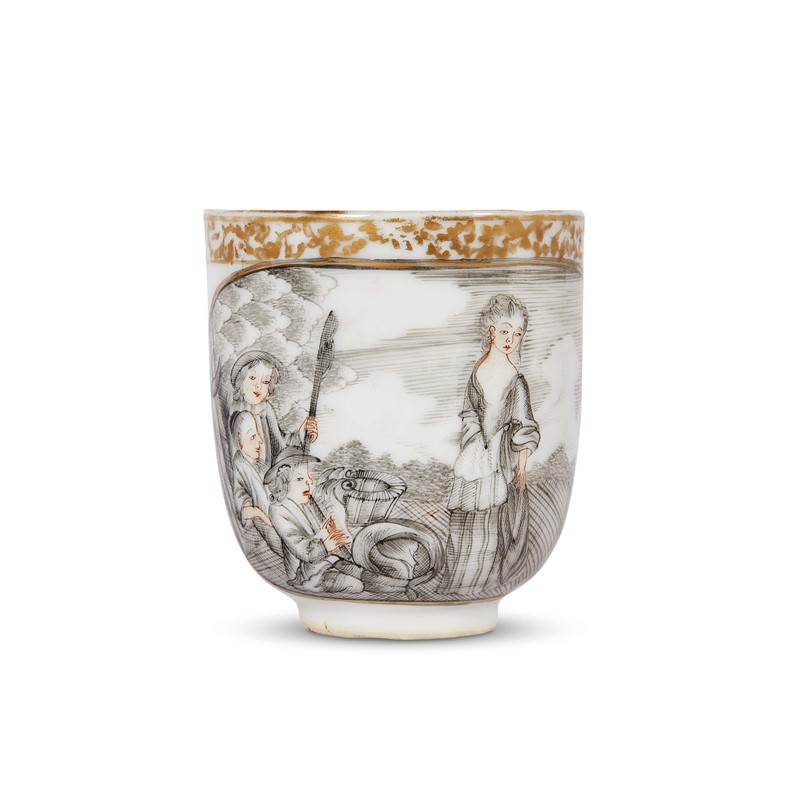 La tazzina a campana, con ansa ad anello, poggia su un piede poco rilevato. Il decoro in oro interessa la fascia attorno all’orlo, mentre al centro della composizione, entro un medaglione circolare, si scorge una scena di concerto con quattro figure nello stile di Watteau: sulla sinistra un musicista seduto sotto un albero, dietro di lui un personaggio seduto e una signora con cappellino, al centro una figura femminile stante rivolta all’esterno, sulla destra un paesaggio in seppia e bistro. La scenetta con musicisti in ambito agreste è spesso utilizzata e richiesta da parte della committenza occidentale. Una variante, con una figura femminile subito dietro al musicista, intitolata “la Dance” e dipinta in policromia, si trova su una caffettiera formalmente nella collezione E. Vandekar a Londra.