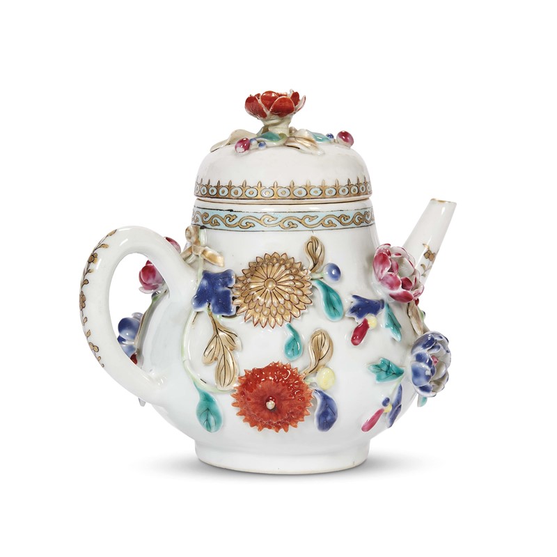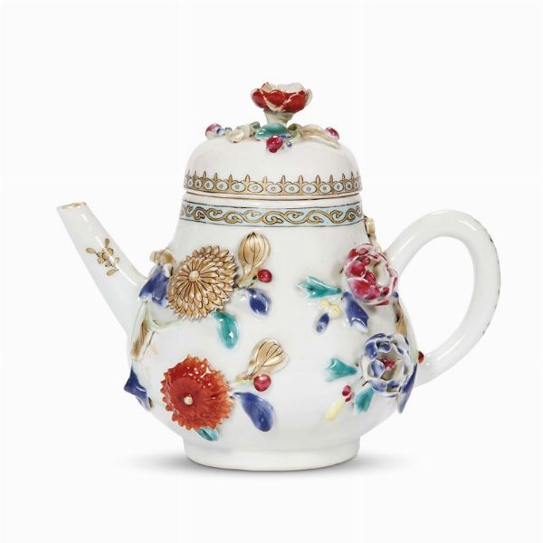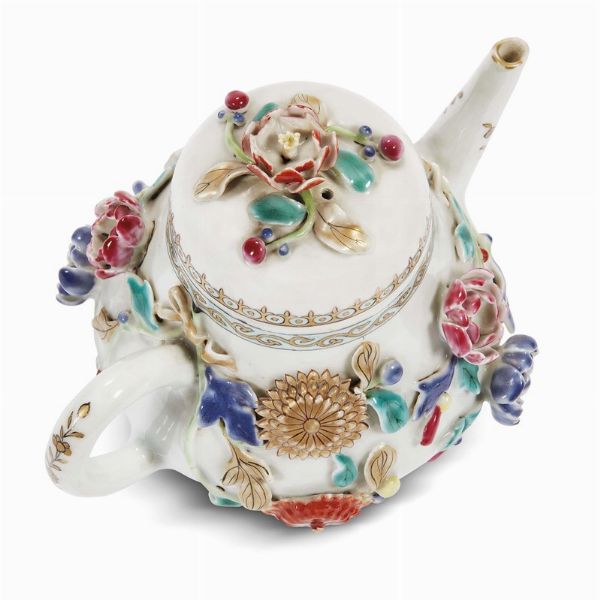 Di porcellana bianca dura e sonora, la teiera ha corpo piriforme, poggia su un basso piede ad anello ed è dotata di un cannello portato alto e di un’ansa ad anello, entrambe decorate a fioretti in nero e oro sovra coperta; il coperchio è a cupola con un pomolo a forma di fiore in rilievo. Il decoro a rilievo applicato caratterizza l’ornato di tutto il corpo con crisantemi e roselline, piccole foglie e bacche dipinte a policromia. Il bordo superiore mostra un motivo a spirale continua, mentre un decoro a punta di lancia orla il bordo del coperchio, entrambi arricchiti da uno smalto azzurro chiaro. Come la precedente, anche questa forma richiama il gusto che unisce ornati ancora marcatamente cinesi a fiori e forme più richieste in occidente e particolarmente in uso a Meissen.