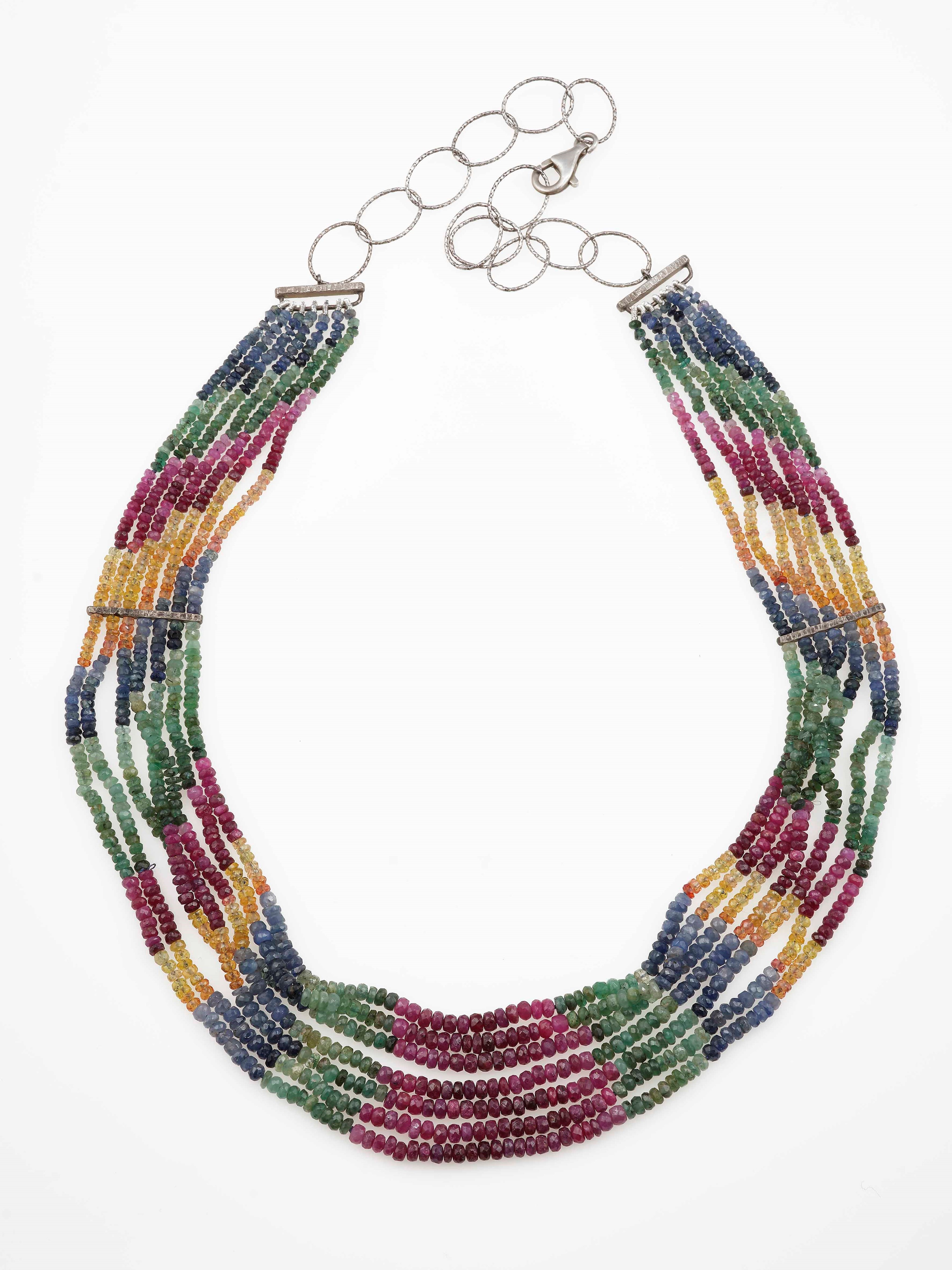 Collana a più fili con zaffiri, smeraldi, rubini e corindoni multicolor