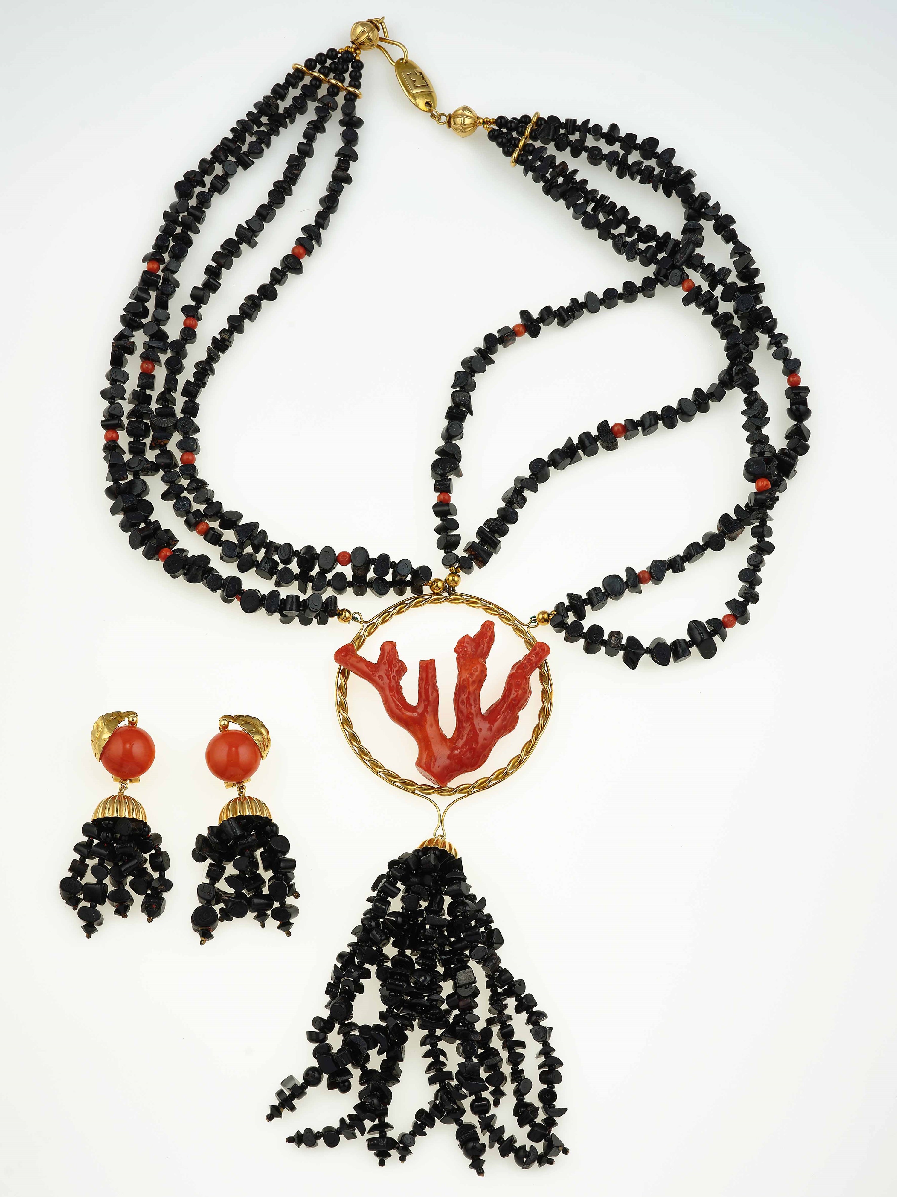 Demi-parure composta da collana ed orecchini con giaietto e corallo