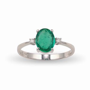 Anello con smeraldo ovale di ct 0.88 circa e due piccoli diamanti