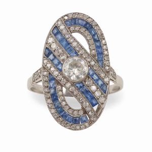 Anello con zaffiro Australia e diamanti taglio navetta e brillante a contorno